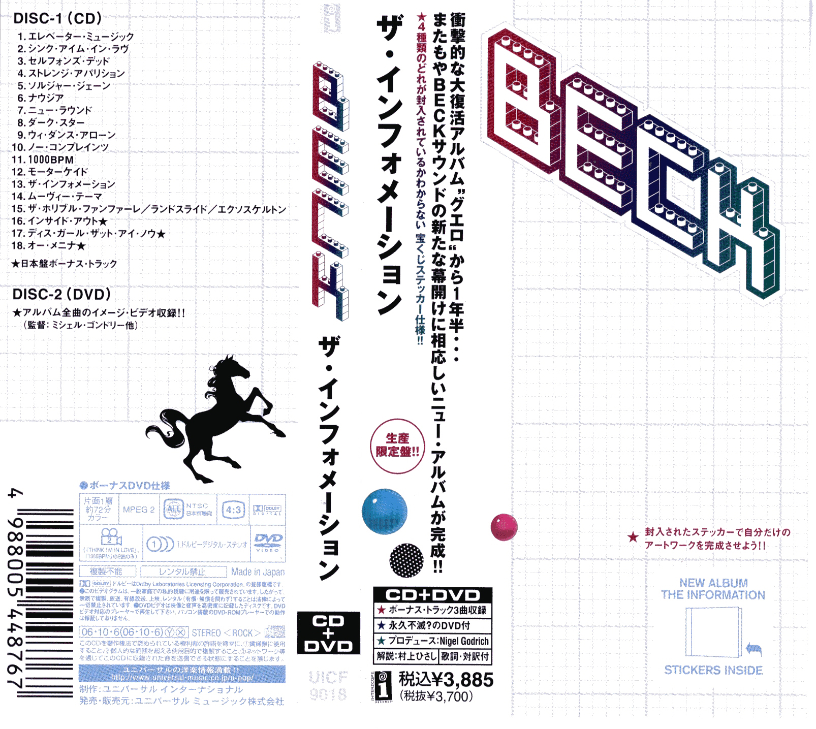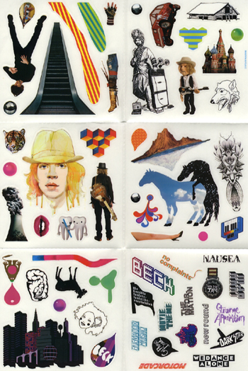 This Japanese sticker sheet looks exactly like American sticker sheet C, and almost exactly like the U.K. sheet 3. There are, however, differences between the Japanese sticker sheet and other sticker sheets. (1) The paper used for the Japanese stickers is lighter, thinner, and more fragile than the paper used for the U.K., German, and Taiwan sticker sheets. (2) The “No Complaints” sticker is the same one that is found on the corresponding American and Canadian sticker sheets, but is different from the U.K. version insofar as the flourish at the end of the “s” goes up and slightly to the left in the U.K. sheet. (3) The song title stickers are a little larger than their counterparts on the U.K., German, and Taiwan sticker sheets. (The song title stickers had to be smaller on these three other sheets, I suppose, so that there would be room for the extra song title stickers.) Although the Japan CD is unique of all of the CD release versions in that there are three bonus songs following the standard 15 tracks, the sticker sheet includes not one of the bonus song titles. The Japan sticker sheet looks and feels identical to the American sticker sheets; even the serial numbers are located in the same place. In the U.K. version the stickers are placed behind the sticker grid, but for the Japanese version the stickers are placed inside the grid, along with the lyrics booklet. Interestingly, there is no “Beck” sticker on the CD case itself; rather, the cardboard “obi strip” supplies the familiar colorful lego-like Beck name.
